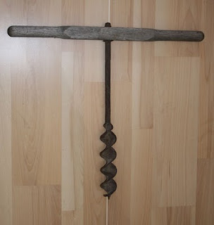 The auger below is the most sophisticated, operating like a modern tap wrench, and was probably used for more sophisticated purposes such as by a shipwright. It is stamped “Douglas” likely referring to the Douglas Manufacturing Company which made such products at Seymour, Connecticut beginning in 1856 and following their purchase by the James Swan Company in 1877.